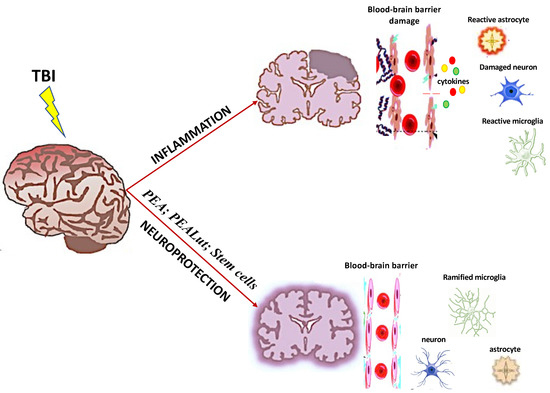 The pathological manifestations of TBI are characterized by BBB alteration arising from cerebral ischemia, inflammation, and redox imbalances [6]. The early phase of trauma is characterized by disruption of the BBB, reduced or altered blood flow, and neuronal and glial damage [6]. Secondary injury starts from this primary injury and emerges hours, days, or months later, involves various events such as oxidative stress, modified calcium homeostasis, inflammation, and axonal damage, terminating in cellular degeneration, disturbed neural circuits, and impaired synaptic transmission and synaptic plasticity [6]. Behaviorally, these alterations manifest as post traumatic headache, depression, individuality changes, anxiety, aggression, and deficits in attentiveness, cognition, sensory processing, and communication [7,8,9].