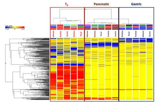 In our experimental conditions, clear differences emerged between EVOOs prior to and after the in vitro gastrointestinal digestion process. In this regard, both the unsupervised HCA and the supervised OPLS-DA multivariate statistical approaches demonstrated the evolution of EVOO bioactive profile moving from T0 (raw samples) to gastric and then pancreatic phases of the simulated in vitro gastrointestinal digestion. In particular, the unsupervised HCA resulted in two main groups, with a first cluster including EVOO samples before digestion and a second cluster representing both digestive phases (i.e., gastric and pancreatic). The output of the HCA consisting on a heat-map built based on the fold-change values of each compound detected is reported in Figure 1.