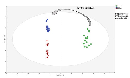 The unsupervised naïve analysis highlighted a hierarchically stronger effect of digestion over cultivar differences, as expected. In detail, the raw EVOO samples clearly showed up-accumulated cluster of compounds when compared to in vitro digested samples; however, it was evident from the heat-map that both gastric and pancreatic phases of in vitro digestion were able to affect the phytochemical profile with a different incidence (Figure 1). Therefore, considering that the main differences during the in vitro gastrointestinal digestion were actually represented, the following multivariate supervised OPLS-DA was carried out aiming to investigate the contribution of each group of metabolites for discrimination purposes. This supervised approach allowed for pointing out differences across the phases of digestion irrespective from cultivars’ contributions. The OPLS-DA score plot built considering the modifications of EVOO samples during the in vitro digestion process is reported in Figure 2.