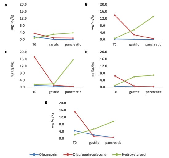 Finally, the major changes involving oleuropein-aglycone (the major EVOO phenolic compound) during in vitro gastrointestinal digestion were investigated and are reported in Figure 3, considering each EVOO sample under investigation.