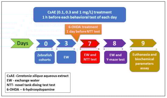 Fifty adults zebrafish (Danio rerio) of wild-type short-fin strain (sex ratio: 50:50 male: female, 3-4-month-old, and 3–4 cm in length) purchased from an authorized commercial dealer (Pet Product S.R.L., Bucharest, Romania) was used in the present study. Fish were randomly divided into groups of 10 fish/24 L housing tanks filled with unchlorinated water, equipped with constant aeration and a light-dark cycle (14/10 h) photoperiod (lights on at 8:00 am). Water temperature within the tanks was maintained at 26 ± 1 °C; pH 7.5; dissolved oxygen at 7.20 mg/L; ammonium concentration <0.004 ppm; conductivity 500 µS and filtrated to avoid the accumulation of organic toxins. Fish were fed twice daily with Norwin Norvitall flake (Norwin, Gadstrup, Denmark). For the behavioral studies, zebrafish were kept for 14 days to accommodate in laboratory conditions and then were divided into 5 groups: the control, the 6-hydroxydopamine (6-OHDA, 250 µM, Sigma-Aldrich, Darmstadt, Germany), and three CsAE treatment groups (0.1, 0.3, and 1 mg/L) administered in three consecutive steps, from 0 to 7 days. The doses of 6-OHDA and CsAE were chosen according to previous reports [52,53]. CsAE (0.1, 0.3, and 1 mg/L) was individually delivered to fish through transferring into 500 mL glass for 1 h, once daily, whereas 6-OHDA (250 µM) treatment was once administered independently by moving into a 500 mL glass, one day before NTT test. Experimental protocol (as is summarized in Figure 1) was approved by the local board of ethics for animal experimentation (No. 15309/2019) and fully complied with the Directive 2010/63/EU of the European Parliament and of the Council of 22 September, 2010 on the protection of animals. Efforts were made to reduce animal suffering and the number of animals utilized.