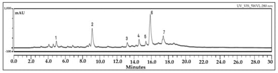 The registered chromatogram is indicated in Figure 2 and shows the main peaks observed for the investigated C. siliqua sample at 280 nm, typical for flavonoids. The standard deviation values (expressed as %) varied between 0.06 and 0.18.