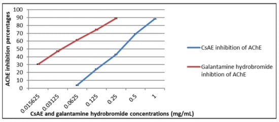 Figure 3. Inhibition percentages of acetylcholinesterase (AChE) exhibited by different concentrations of CsAE (0.0625–1 mg/mL) and galantamine hydrobromide (0.015–0.25 mg/mL). Coefficient and Regression equation of inhibition displayed by CsAE: y = 21.398x − 61.181, R2 = 0.9972, IC50 = 0.29 ± 0.004 mg/mL. Coefficient and Regression equation of inhibition displayed by galantamine hydrobromide: y = 14.406x + 17.386, R2 =0.9985, IC50 = 0.03 ± 0.0005 mg/mL.