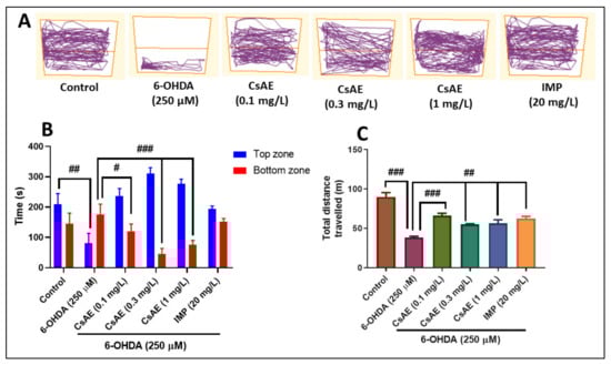 Figure 4. Ceratonia siliqua aqueous extract (CsAE, 0.1, 0.3, and 1 mg/L) ameliorated locomotion pattern and reduced anxiety in the NTT test. (A) Representative locomotion tracking pattern of the control, 6-hydroxydopamine (6-OHDA) (250 µM), CsAE (0.1, 0.3, and 1 mg/L), and imipramine (IMP) (20 mg/L) treated groups. (B) Represent the time spent in the top/bottom zone by zebrafish in the tank in different groups. (C) Represent the total distance travelled by zebrafish in the tank in different groups. Values are means ± S.E.M. (n = 10). For Tukey’s post hoc analyses: (B) Control vs. 6-OHDA (250 µM): ##p < 0.001, 6-OHDA (250 µM) vs. CsAE (0.1 mg/L): # p < 0.01, 6-OHDA (250 µM) vs. CsAE (0.3 mg/L): ### p < 0.0001 and 6-OHDA (250 µM) vs. CsAE (1 mg/L): ### p < 0.0001; (C) Control vs. 6-OHDA (250 µM): ### p < 0.0001, 6-OHDA (250 µM) vs. CsAE (0.1 mg/L): ###p < 0.0001, 6-OHDA (250 µM) vs. CsAE (0.3 mg/L): ## p < 0.001 and 6-OHDA (250 µM) vs. CsAE (1 mg/L): ## p < 0.001.