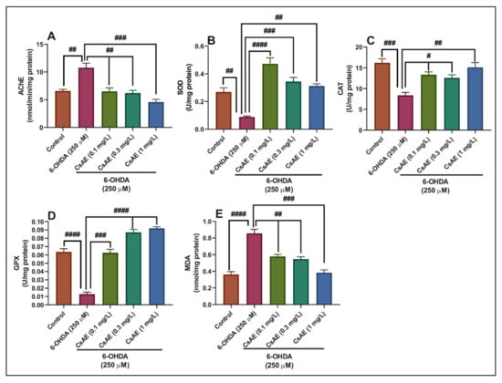 Figure 6. Ceratonia siliqua aqueous extract (CsAE, 0.1, 0.3, and 1 mg/L) exhibited an anti-AChE effect and improved brain antioxidant status. The enzyme’s specific activities: (A) Acetylcholinesterase (AChE), (B) Superoxide dismutase (SOD), (C) Catalase (CAT), and (D) Glutathione peroxidase (GPX) and (E) Malondialdehyde (MDA) level. Values are means ± S.E.M. (n = 10). For Tukey’s post hoc analyses: (A) Control vs. 6-OHDA (250 μM): ##p < 0.001, 6-OHDA (250 µM) vs. CsAE (0.1 mg/L): ## p < 0.001, 6-OHDA (250 µM) vs. CsAE (0.3 mg/L): ## p < 0.001 and 6-OHDA (250 µM) vs. CsAE (1 mg/L): #### p < 0.0001; (B) Control vs. 6-OHDA (250 μM): ## p < 0.001, 6-OHDA (250 µM) vs. CsAE (0.1 mg/L): #### p < 0.00001, 6-OHDA (250 µM) vs. CsAE (0.3 mg/L): ### p < 0.0001 and 6-OHDA (250 µM) vs. CsAE (1 mg/L): ## p < 0.001; (C) Control vs. 6-OHDA (250 μM): ### p < 0.0001, 6-OHDA (250 µM) vs. CsAE (0.1 mg/L): # p < 0.01, 6-OHDA (250 µM) vs. CsAE (0.3 mg/L): # p < 0.01 and 6-OHDA (250 µM) vs. CsAE (1 mg/L): ## p < 0.001; (D) Control vs. 6-OHDA (250 μM): #### p < 0.00001, 6-OHDA (250 µM) vs. CsAE (0.1 mg/L): ### p < 0.0001, 6-OHDA (250 µM) vs. CsAE (0.3 mg/L): ### p < 0.0001 and 6-OHDA (250 µM) vs. CsAE (1 mg/L): #### p < 0.00001; and (E) Control vs. 6-OHDA (250 μM): #### p < 0.00001, 6-OHDA (250 µM) vs. CsAE (0.1 mg/L): ## p < 0.001, 6-OHDA (250 µM) vs. CsAE (0.3 mg/L): ## p < 0.001 and 6-OHDA (250 µM) vs. CsAE (1 mg/L): ### p < 0.0001.