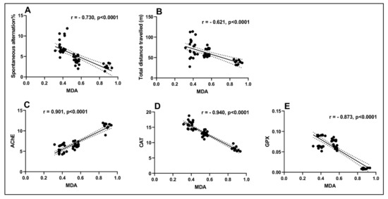 Figure 7. Correlation analyses between behavioral and biochemical parameters (Pearson’s correlation, n = 10): (A) spontaneous alternation% vs. MDA: r = −0.730, p < 0.0001; (B) total distance travelled vs. MDA: r = −0.621, p < 0.0001; (C) AChE vs. MDA: r = 0.901, p < 0.0001; (D) CAT vs. MDA: r = −0.940, p < 0.0001 and (E) GPX vs. MDA: r = −0.873, p < 0.0001. Data expressed are spontaneous alternation %, total distance travelled (m), AChE (nmol/min/mg protein), CAT (U/mg protein), GPX (U/mg protein), and MDA (nmol/mg protein).