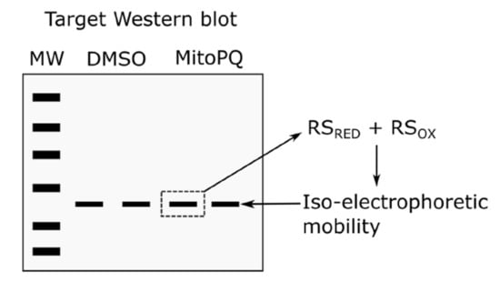 The iso-electrophoretic mobility problem. An exemplar scenario is depicted wherein Western blotting is used to detect a change in the redox state of a target in biological samples treated with and without (i.e., DMSO) the pro-oxidant mitochondria targeted paraquat (MitoPQ). For many protein thiols, Western blotting is unable to detect differences in target redox state because reduced and reversibly oxidized thiols possess similar electrophoretic mobility. MW denotes molecular weight.