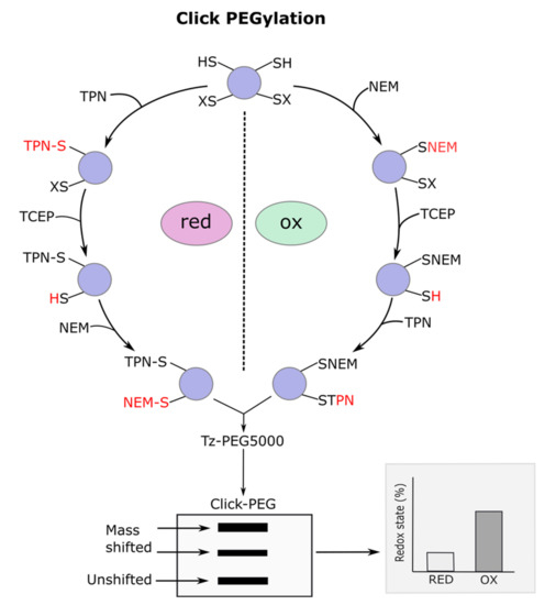 - Lee, Y.-J.; Chang, G.-D. Quantitative display of the redox status of proteins with maleimide-polyethylene glycol tagging. Electrophoresis 2019, 40, 491–498. [Google Scholar] [CrossRef]