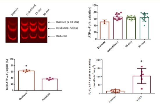 Until recently, reversible subunit alpha oxidation had only been assessed by redox proteomics usually in either isolated mitochondria or disease models [131]. Intrigued by a possible physiological redox regulatory role, we asked whether the alpha subunit is reversibly oxidized in oocytes and zygotes from the key developmental model Xenopus laevis (X. laevis) [132,133,134]. We hypothesized that the alpha subunit would be reversibly oxidized in oocytes to prevent wasteful ATP hydrolysis [135], but that fertilization induced ADP may provide an instructive cue to relieve reversible thiol oxidation to initiate embryonic mitochondrial ATP synthesis [136]. Unexpectedly, reciprocal reduced and reversibly oxidized catalyst-free Click PEGylation workflows revealed the ATP synthase is substantially (~65%) oxidized before and after fertilization (Figure 4) [116]. To place our findings in context, the median oxidation of thiols in the mammalian proteome is ~12% [41] and the Oximouse dataset (see [91]) reveals C244 and C294 are ~20% reversibly oxidized. Substantial reversible thiol oxidation is consistent with a distinct subset of thiols being persistently oxidized (≥20%) and tissue specific redox signatures [91]. Click PEGylation reveals substantial reversible oxidation of ~20% of the total available thiols (~10-11) in the X. laevis ATP synthase. Further analysis revealed a single thiol was preferentially modified. Consistent with a single thiol being modified, selective reduction experiments unveiled RSSG as the dominant reversible thiol oxidation type [116]. Reversible thiol oxidation is biologically meaningful because reducing oxidized thiols significantly increased mitochondrial ATP synthase activity in X. laevis oocytes (Figure 4) [137].