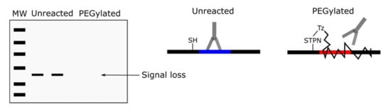 Click PEGylation challenges. Left to right. Signal loss in the PEGylated compared to the unreacted lanes is often observed. In the unreacted samples, the antibody can bind to the epitope. PEGylation, however, may sterically impede epitope binding resulting in partial or complete signal loss.