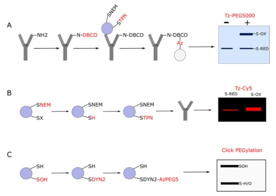 Beyond affording a simple method to check successful Click PEGylation, anti-PEG makes it possible to use a single antibody to assess global RSSG, RSNO, and RSSR using selective reduction strategies. Single antibody global blotting is a useful, inexpensive tool to screen reversible thiol oxidation type. Single antibody reversibly modification type screening would be advanced by the development of a Tz-PEG20 reagent to reduce band complexity. 6-methyltetrazine functionalized Biotin is, however, commercially available and can be coupled to streptavidin functionalized fluorophores [137]. Optionally, immobile anti-PEG or streptavidin supports could be used to purify a certain reversible thiol oxidation type for proteomic analysis. It is, however, stressed that excellent technologies like biotinylated NEM already exist to use one tool (i.e., a streptavidin conjugated fluorophore) to assess multiple chemotypes at the global level.