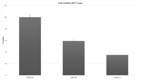 The MTT cell viability assay highlighted a significant and different trend in RPE treated cells versus control. The addition of A2E to cultures led to a decreased percentage of cell viability, with the lowest peak at 6 h after treatment (Figure 1).