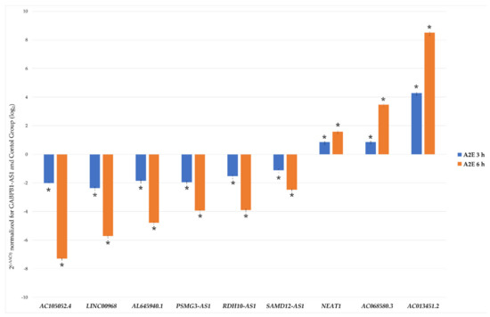 qRT-PCR validation of chosen differentially expressed lncRNAs. Histograms report the mean expression values (n of replicate for each group = 6) of nine chosen differentially expressed lncRNAs produced by qRT-PCR experiments, obtained after application of 2–ΔΔCt method, normalized to the best stable lncRNA GABPB1-AS1 (not shown) and control group. Obtained results were statistically significant (ANOVA Bonferroni-corrected * p-values < 0.01).