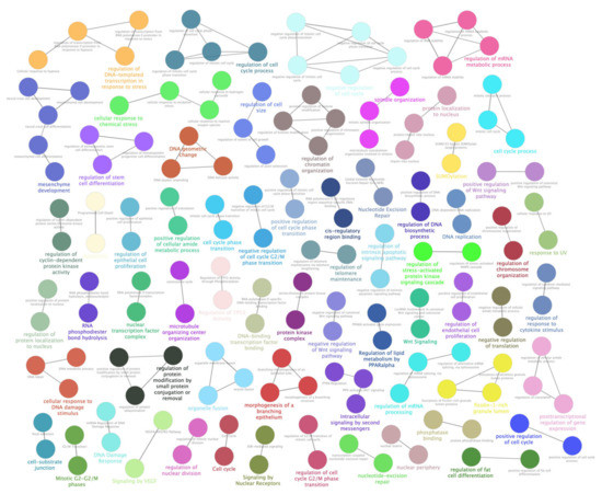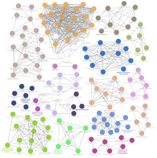 ClueGO enrichment analysis of a first cluster of overrepresented Gene Ontology (GO) terms. The ClueGO plugin of Cytoscape permitted to find a first rich cluster of overrepresented GO processes and a network of connected GO terms was elaborated. Each node represents a GO biological process, and the colors refer to the GO group. Sixteen GO groups are present in the network, one representing GO biological process per group is named in the figure. The edges reflect the relationships between the terms based on the similarity of their associated genes.