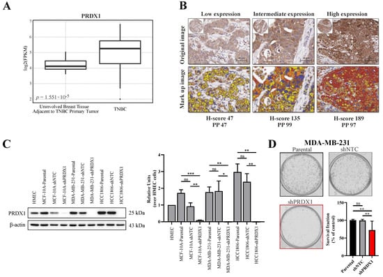 Characterization of peroxiredoxins 1 (PRDX1) expression level and its knockdown in triple-negative breast cancer. (A) Analysis of the expression of PRDX1 mRNA in normal (n = 21) and Triple-negative breast cancer (TNBC) (n = 42) tissues available in the analyzed NCBI Gene Expression Omnibus (GEO) database. (B) Representative cores from breast cancer TNBC tissue microarray (TMA), stained using anti-PRDX1 antibody via IHC approach, displaying low, intermediate, and high PRDX1 protein expression (top) and the corresponding mark-up images following application of image analysis approach (bottom). Image analysis derived corresponding H-score and percentage of positive cells (PP) is given below the images: red refers to high expression, brown is intermediate, and yellow relates to low expression. (C) Representative Western blotting results (left) showing knockdown of PRDX1 protein in MCF-10A, MDA-MB-231, and HCC1806 cell lines compared to parental and shNTC controls. β-actin was used as a loading control. Bands were quantified by densitometry; it was calculated as the quotient of the densitometry signal for PRDX1 band and that for β-actin and then normalized to that of the HMEC. Averaged value from three independent experiments is shown (right) (* p < 0.05, ** p < 0.01, *** p < 0.001, ns: not significant). (D) Representative images for the colony formation in MDA-MB-231 cells and the cell survival fraction (SF) calculated by clonogenic assay. The percent SF over parental control is presented as mean ± S.E.M. Data shown are cumulative results from three independent experiments repeated in triplicates. Statistical analysis was performed with one-way ANOVA followed by Tukey’s honestly significant difference (HSD) post hoc test when significance was detected (** p < 0.01, ns: not significant).