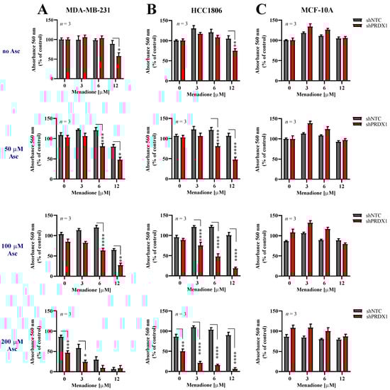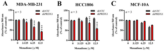 In our previous studies, we showed that the downregulation of PRDX1 in breast cancer cell lines, including TNBC cell lines, results in markedly increased toxicity of Asc []. In addition, He et al. reported that PRDX1 knockdown potentiates Men-induced, but not classical chemotherapy-induced, toxicity in human cervical adenocarcinoma HeLa and human lung cancer A549 cell lines, but to a lesser extent in HUVEC cells or normal fibroblasts []. Therefore, in this study, we evaluated the effects of PRDX1 knockdown on sensitivity to Men in two TNBC cell lines (MDA-MB-231 and HCC1806) and compared them to the non-malignant MCF-10A cell line, also of triple-negative phenotype. As shown in Figure 2, the toxicity of Men was significantly potentiated by PRDX1 knockdown only in TNBC cell lines, but not in MCF-10A cells. Indeed, the calculated EC50 value for Men for HCC1806-shNTC cells was 65.2 ± 8.7 µM, while for MDA-MB-231-shNTC cells it was 35.4 ± 6.1 µM, and those results were significantly different (Figure S4). However, this difference in response to Men was no longer seen in MDA-MB-231-shPRDX1 vs. HCC1806-shPRDX1 cells (Figure 2A,B), i.e., the respective EC50 values for HCC1806-shPRDX1 (23.0 ± 7.0 µM) and MDA-MB-231-shPRDX1 (12.0 ± 3.0 µM) (Figure S4). We previously observed a similar phenomenon in the case of TNBC cell lines response to Asc, as reported in our recent work (Figure S5 in []), which suggests that the mechanism of resistance to Men or Asc in TNBC cells can be indeed PRDX1-dependent. This finding corroborates the particular role of PRDX1 as a gatekeeper of redox homeostasis in TNBC cells.
