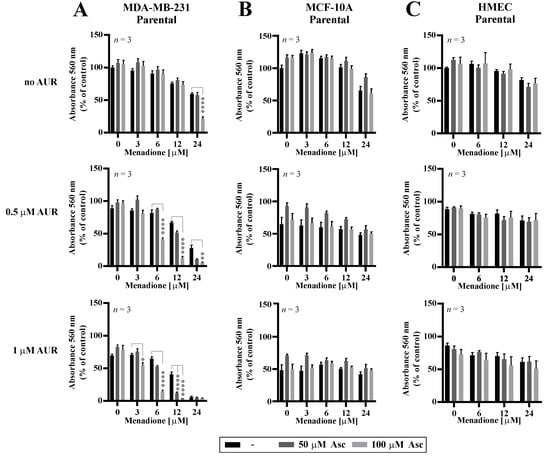 Following the results of potentiated effectiveness of Asc/Men combination in TNBC cells with genetically downregulated PRDX1, we evaluated how the chemical inhibition of the PRDX1-related enzymatic system influences the response to Asc/Men in TNBC cells. Previously in our studies, we utilized several chemical inhibitors of the PRDX1-related system, such as SK053 [], adenanthin [], or auranofin (AUR) []. Out of these compounds, only AUR is a clinically applicable agent. It is also worth noting that our team and others previously reported the synergistic cytotoxic effects of a combination of AUR and Asc in B-cell malignancies [] and TNBC [], respectively. Therefore, in this study, we chose AUR for the combination with the Asc/Men treatment. We observed a significant amplification of the antitumor effects in the MDA-MB-231 (Figure 4A, confirmed by combination index calculations, as presented in Figure S6A) and, to the lesser extent, HCC1806 (Figure S6B) TNBC cell lines when AUR and Men/Asc were applied together, but not in the non-malignant MCF-10A cells (Figure 4B) or the telomerase-immortalized human mammary epithelial cells (HMEC, Figure 4C). Again, the calculated values of combination indexes confirm synergistic interactions in triple AUR/Asc/Men combinations (Figure S6A,C for MDA-MB-231 and HCC1806 cells, respectively).