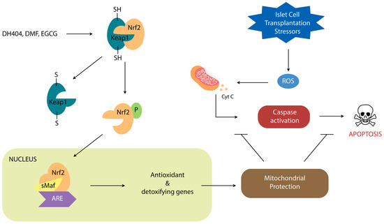 Activation of the Nrf2/Keap1 pathway has been demonstrated to confer antioxidant protection in every step of the islet cell transplantation. This is not surprising as the cell is exposed to taxing conditions every step of the way. While dh404, DMF, and EGCG have all been described to have good safety profiles, it is important to note that such is the case when the appropriate dose is used. Many studies have proven the dose-dependent effects of Nrf2 activators. Thus far, dh404 has proven to have an optimal concentration in vivo at 500 nM, DMF at 0.25–5 µM, and EGCG at 100 µM. When the concentrations are too low or too high relative to their optimum, oxidative stress eventually leads to cell death [86,90,91]. Thus, further confirmatory testing at optimal dose of those medications in different applications are necessary prior to human experimentation. Furthermore, the context of application for these Nrf2 activators must be determined as it has been described that they are most effective under stress. Whether the recipient may benefit from Nrf2 activators prophylactically to achieve antioxidant protection prior to transplant would also be worth investigation.