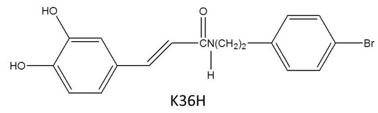 Caffeamide exhibits potent antioxidative activity and scavenging of free radicals [26]. N-(4-bromophenethyl) caffeamide (K36H) (Figure 1) is a caffeamide derivative that inhibits the breakdown of type I procollagen and stimulates the synthesis of collagen in human skin fibroblasts after exposure to ultraviolet B (UVB) [27]. K36H also exhibits anti-inflammation in human skin fibroblasts. Furthermore, it inhibits melanogenesis and melanogenesis-related proteins such as tyrosinase and TRP-1 in B16F0 cells [17]. UVA is the most prevalent form of solar radiation that reaches the earth surface; therefore, protection against UVA-induced skin damage is essential [28,29]. Thus, this study was intended to discover the reparative effects of K36H on apoptosis and DNA damage in human epidermal keratinocytes caused by UVA-induced oxidation.