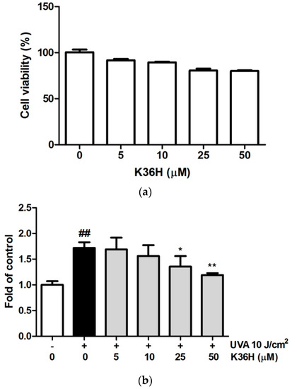 (a) Cell survival rate (%) of K36H in HaCaT cells. (b) K36H reduced intracellular oxidative stress induced by ultraviolet A (UVA)-irradiation in human epidermal keratinocytes. (## p < 0.01 compared with the nonirradiated group. * p < 0.05; ** p < 0.01 compared with the nontreatment group.).