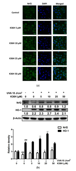Effect of K36H on (a) Nrf2 translocation and (b) UVA-upregulated expression of Nrf2 and HO-1 in human epidermal keratinocytes. Significant difference versus the nonirradiated group: ### p < 0.001. (* p < 0.05; ** p < 0.01; *** p < 0.001 compared with the nontreatment group).