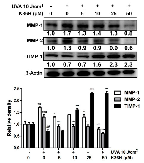 MMPs are zinc-dependent endogenous proteases related to cell differentiation, proliferation and migration as well as extracellular matrix (ECM) degradation and modification [41]. MMP-1 is the main proteinase that degrades type I and III collagen in the dermis, whereas MMP-2 degrades type IV collagen and gelatin [42]. After irradiation with 10 J/cm2 of UVA, the protein expressions of MMP-1 and MMP-2, respectively, increased to 1.7 and 1.3 times those in the control group and decreased to 1.3 and 0.9 time the control group level with 5-μM K36H treatment (Figure 4). Among endogenous MMP inhibitors, the expression of tissue inhibitor of metalloproteinase (TIMP)-1 decreased to 0.7 times the control group levels after UVA exposure and recovered to 1.6 times the control group level after 10-μM K36H treatment.
