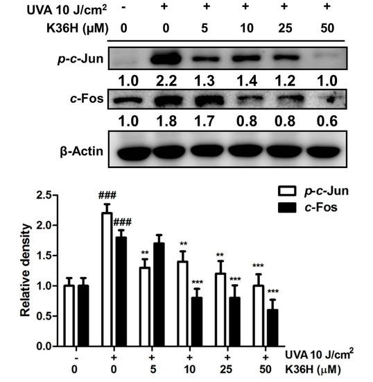 Effect of K36H on UVA-induced p-c-Jun and c-Fos expression in human epidermal keratinocytes. Significant difference versus the nonirradiated group: ### p < 0.001. Significant difference versus the nontreatment group: ** p < 0.01; *** p < 0.001.