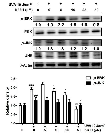 Effect of K36H on UVA-induced phosphorylation of p-extracellular-signal-regulated kinases (p-ERKs) and p-Jun N-terminal kinase (p-JNK) expression in human epidermal keratinocytes. Significant difference versus the nonirradiated group: ## p < 0.01; ### p < 0.001. Significant difference versus the nontreatment group: * p < 0.05; *** p < 0.001.
