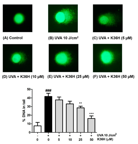 The protective effects of K36H on DNA damage were assayed using the comet assay. As shown in Figure 7, after UVA irradiation, the DNA in the tail increased to 41.7%; after treatment with 5–50-μM K36H, the DNA in the tail significantly decreased to 37.7%, 33.1%, 28.5% and 16.1%. K36H reduced DNA damage induced by UVA light exposure in keratinocytes.