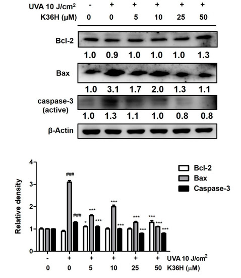 Effect of K36H on UVA-induced Bax, caspase-3 and reduced Bcl-2 protein expression in human epidermal keratinocytes. Significant difference versus the nonirradiated group: ### p < 0.001. Significant difference versus the nontreatment group: * p < 0.05, *** p < 0.001.
