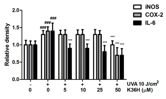 To analyze the anti-inflammatory effect of K36H, we used western blotting to observe the protein expression of inflammatory mediators, including COX-2, iNOS and IL-6 proteins. The iNOS protein expression increased to 1.3-fold in the keratinocytes of the control group and decreased to 1.0-fold of the control group levels after 50-μM K36H treatment (Figure 9). COX-2 expression was increased 1.4-fold after UVA radiation; it decreased significantly, to 0.7 times that of the control level after 50-μM K36H treatment. The IL-6 expression increased to 1.4-fold after irradiation with 10 J/cm2 UVA and was downregulated to 0.9-fold with 5-μM K36H treatment (Figure 9).
