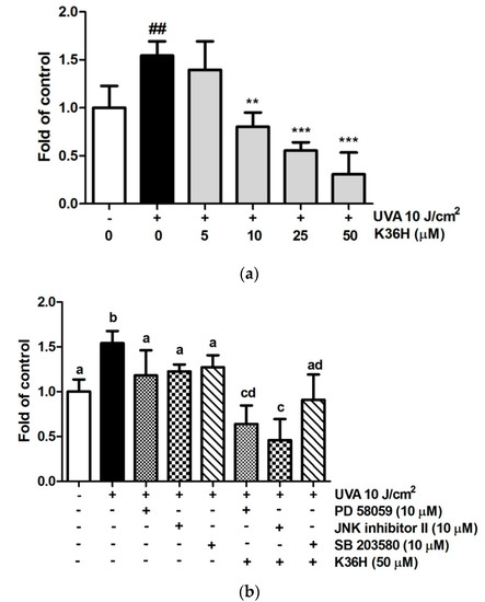As shown in Figure 5, the expression of c-Jun and c-Fos protein increased 2.2- and 1.8-fold after UVA radiation and significantly decreased to 1.4- and 0.8-fold after 10-μM K36H treatment. AP-1 comprises proteins belonging to the c-Fos and c-Jun family. AP-1 translocates from the cytoplasm into the nucleus and modulates downstream genes and the expression of proteins such as MMP-1 and MMP-2, which cause ECM degradation, resulting in skin aging [43,44].
