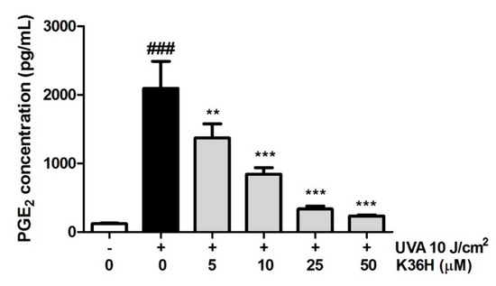 Effect of K36H on prostaglandin E2 (PGE2) production in human epidermal keratinocytes. Significant difference versus the nonirradiated group: ### p < 0.001. Significant difference versus the nontreatment group: ** p < 0.01; *** p < 0.001.