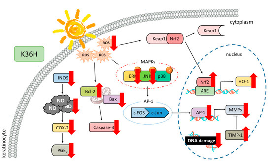 This study showed that K36H treatment prevented UVA-induced oxidative damage, such as DNA damage and apoptosis, in keratinocytes (Figure 12). K36H upregulated the self-oxidative defense system including Nrf2 and HO-1 to ameliorate UVA-induced damage. K36H had excellent free-radical-scavenging and anti-inflammatory properties. The photoprotective property of K36H may be due to its antioxidant activity.