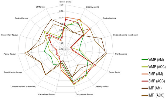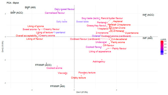 Principle component analysis (PCA) biplot of fat-filled whole milk powder (FFWMP), skim milk powder (SMP), and infant milk formula (IMF) samples at T8 demonstrating the trends observed throughout the study for the ranked descriptive analysis (RDA) and volatile analyses. AM: ambient, 21 °C; ACC: accelerated, 37 °C.