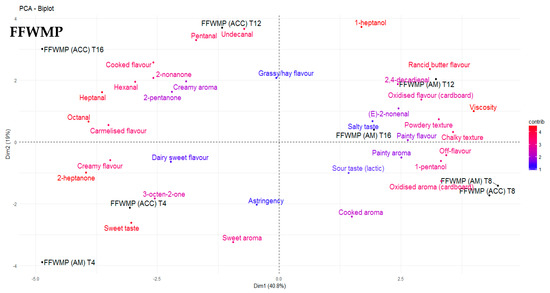 Principle component analysis (PCA) biplot demonstrating the correlations between the sensory perception and volatile compounds for fat-filled whole milk powder (FFWMP) at T4, T8, T12, and T16 of storage. AM: ambient, 21 °C; ACC: accelerated, 37 °C.
