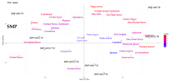 PCA biplot demonstrating the correlations between the sensory perception and volatile compounds for skim milk powder (SMP) at T4, T8, T12, and T16 of storage. AM: ambient, 21 °C; ACC: accelerated, 37 °C.