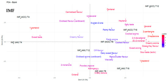 Principle component analysis (PCA) biplot demonstrating the correlations between the sensory perception and volatile compounds for infant milk formula (IMF) samples at T4, T8, T12, and T16 of storage. AM: ambient, 21 °C; ACC: accelerated, 37 °C.