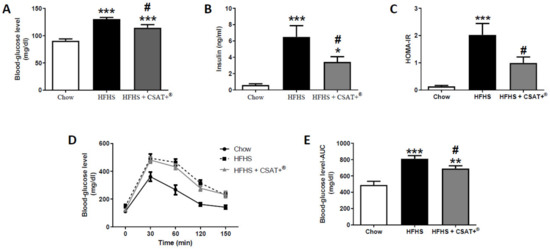 Blood glucose (A) and insulin (B) plasma levels, Homeostatic Model Assessment of Insulin Resistance (HOMA-IR) (C), oral glucose tolerance test (D) and area under the curve (E) in mice fed a standard diet (Chow), a high fat diet/sucrose diet (HFHS) or high fat diet/sucrose diet supplemented with the carob pod extract (HFHS + CSAT+®). * p < 0.05; ** p < 0.01; *** p < 0.001 vs. chow. # p < 0.05 vs. HFHS. Values are represented as mean ± S.E.M; n = 12 samples/experimental group.