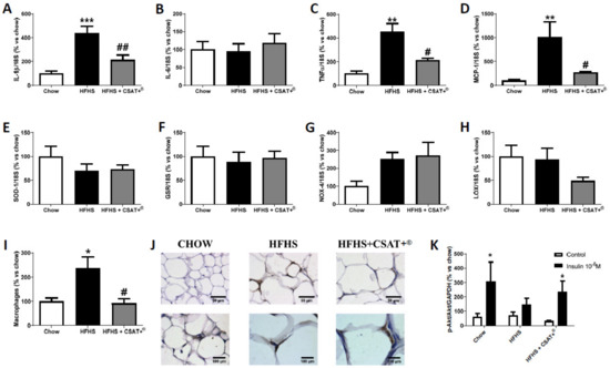 mRNA levels of interleukin-1 beta (A), interleukin-6 (B), tumor necrosis factor-alpha (C), monocyte chemoattractant protein (D), superoxide dismutase-1 (E), glutathione reductase (F), NADPH oxidase-4 (G), and lipoxygenase (H) in retroperitoneal adipose tissue of mice fed a standard diet (Chow), a high fat diet/sucrose diet (HFHS) or high fat diet/sucrose diet supplemented with the carob pod extract (HFHS + CSAT+®). Macrophages infiltration was measured by immunohistochemistry (I,J) and pAKT/AKT ratio (K) was measured in retroperitoneal adipose tissue after 15 min of explant incubation with or without 10−6 M insulin. * p < 0.05; ** p < 0.01; *** p < 0.001 vs. chow # p < 0.05; ## p < 0.01 vs. HFHS. Values are represented as mean ± S.E.M; n = 5–8 samples/experimental group.