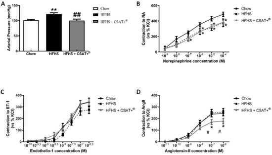 Compared to chow animals, HFHS diet induced a significant increase in mean arterial pressure (p < 0.01) that was totally prevented by CSAT+® treatment (p < 0.01) (Figure 4A).