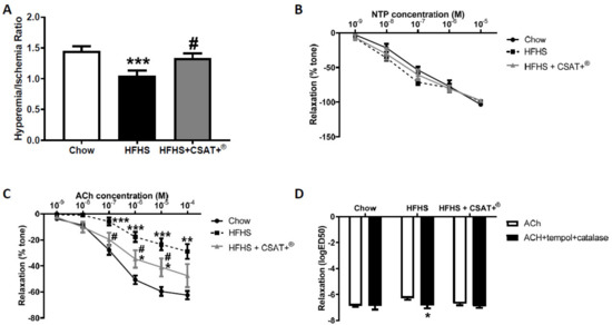 Reactive hyperemia (A),relaxation of thoracic aortic rings to sodium nitroprusside (B) and acetylcholine alone (C) or in the in the presence/absence of tempol+catalase (D) of mice fed a standard diet (Chow), a high fat diet/sucrose diet (HFHS), or high fat diet/sucrose diet supplemented with the carob pod extract (HFHS + CSAT+®). * p < 0.05; ** p < 0.01 vs. chow; *** p < 0.001 vs. chow. # p < 0.05 vs. HFHS. Values are represented as mean ± S.E.M; n = 10–12 samples/experimental group.