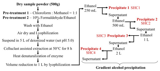 The ratio of ethanol was determined following optimization studies. As the first step in gradient ethanol precipitation, 250 mL of ethanol was gently added to 1 L of the extract while stirring. The mixture was incubated at 4 °C for 12 h, allowing it to equilibrate while precipitating the polysaccharides (Figure 1). After, the mixture was centrifuged at 5000× g for 20 min at 4 °C to obtain the first precipitate designated as SHC1. Sequentially the second, third and fourth precipitates were collected by, respectively adding 500 mL, 1 L and 2 L of ethanol to the supernatant after each precipitation step. All precipitates were dually washed with 95% ethanol (homogenization) and centrifuged to recover the polymer. Finally, the precipitates were dissolved in deionized water and dialyzed using 3.5-kD molecular weight cutoff dialysis membranes (Spectra/Por, Los Angeles, CA, USA). Polysaccharide fractions were lyophilized and stored at −20 °C for proceeding experiments.