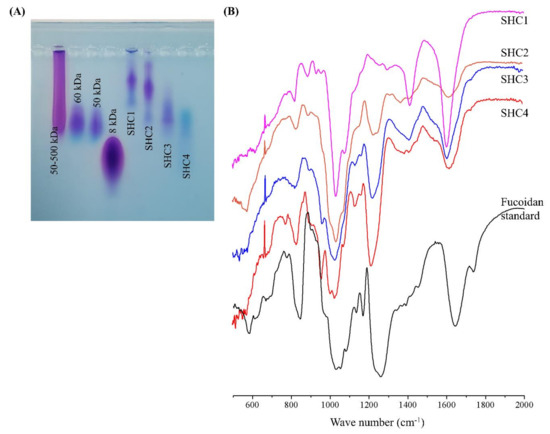 Characterization of polysaccharide fractions (SHC1–SHC4) obtained by step gradient ethanol precipitation. (A) Molecular weights (MW) distribution analysis of polysaccharide fractions compared to 50–500-kDa, 60-kDa, 50-kDa and 8-kDa MW standards and (B) vibrational spectra of polysaccharide fractions compared to commercial fucoidan standard.