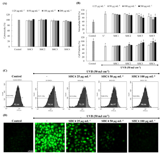 HaCaT keratinocytes were incubated for 2 h with different concentrations of samples. The cell culture media was withdrawn from the wells, once washed, and then filled with PBS. Wells except the control were exposed to UVB (50 mJ cm−2) by a UVP CL-1000L ultraviolet cross-linker (Upland, CA, USA). Immediately after the irradiation, PBS was withdrawn, once washed, and replaced with serum-free culture media. Intracellular ROS levels were measured after incubating for an hour (DCFH2-DA assay) and cell viability was measured by MTT assay after incubating for 24 h [1]. SHC4 that indicated superior antioxidant and cytoprotective effects were further verified by DCFH2-DA staining of cells and analysis by fluorescence microscopy (EVOS FL Auto 2 Imaging, ThermoFisher Scientific, CA, USA) and flow cytometry (CytoFLEX, Beckman Coulter, PA, USA) based on methods described in our previous publications [8].