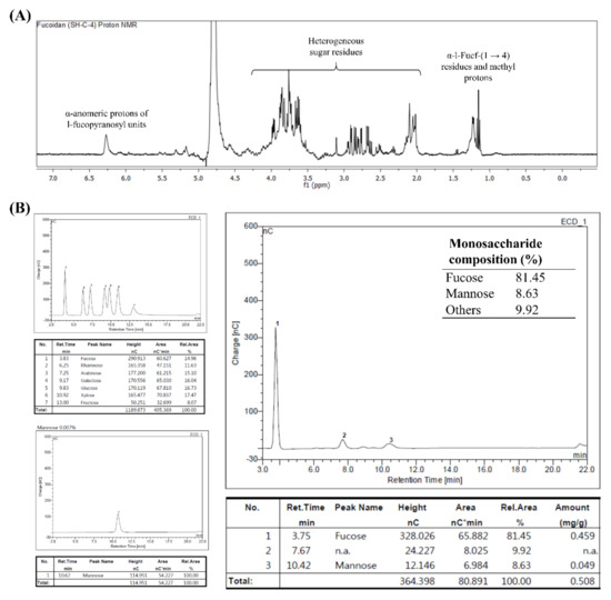 Integrated with FTIR spectra, monosaccharide composition analysis and NMR spectra provide reliable evidence to characterize fucoidans. The NMR spectrum of SHC4 (Figure 4A) was obtained with a relatively low resolution, mainly because of the heterogeneous nature of the polymer. However, we were able to identify some characteristic peaks in the spectrum, signifying fucoidans. The intense signals obtained between 1.1–1.2 ppm represented protons of methyl groups in fucopyranose. Based on previous records, the occurrence of peaks in the 1.1–1.2 ppm area is attributable to an α-L-Fucp-(1→4) connectivity pattern [16]. The proton signals between 2.0–2.2 ppm represent alcoholic protons [16], while signals between 3.5–4.0 ppm were attributed to H2-H6 sugar residues. The prominent signal at 4.6 ppm, 1[H] can be attributed to protons at the anomeric center of 3-linked d-galactopyranosyl residues [16,17]. The signal at 6.25 ppm indicates α-anomeric protons of l-fucopyranosyl units [15]. The obtained results were similar to findings recorded from other brown seaweeds [3,15,16,17]. HPAEC-PAD analysis of monosaccharide composition (Figure 4B) proposed higher fucose (81.45%) and mannose (8.63%) content, which suggested that SHC4 was a mannofucan.