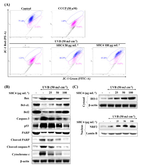 Western blot analysis of the protective effects of SHC4 against UVB-induced apoptosis mediators. Analysis of the UVB protective effects of SHC4 on (A) changes in mitochondria inner transmembrane potential by JC-1 assay, (B) mediation of mitochondria-mediated apoptotic pathway proteins against UVB-induced apoptosis and (C) effects on intracellular antioxidant enzymes. HaCaT cells were treated with different doses of SHC4 for 2 h and exposed to UVB radiation. Cells were, respectively harvested after 4 h and 24 h for the JC-1 assay and western blot analysis. Repeatability of results was validated with three independent determinations (n = 3).