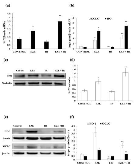 In our cellular models of IR, we also assessed whether Ezetimibe affects Nrf2/ARE and UPR gene expression. After IR, there were no significant changes in Nrf2 (mRNA and protein) expression (Figure 3a,c,d) and in that of the ARE-correlated genes HO-1 and GCLC (Figure 3b,e,f). To the contrary, when THP-1 cells were preincubated with Ezetimibe, we found a significant up-regulation of the Nrf2 mRNA and nuclear protein (p < 0.01) under basal conditions that was even more evident in THP-1 cells subjected to IR (Figure 3a,c,d). Accordingly, the mRNA and protein expression of HO-1 and GCLC was significantly up-regulated by Ezetimibe (Figure 3b,e,f).