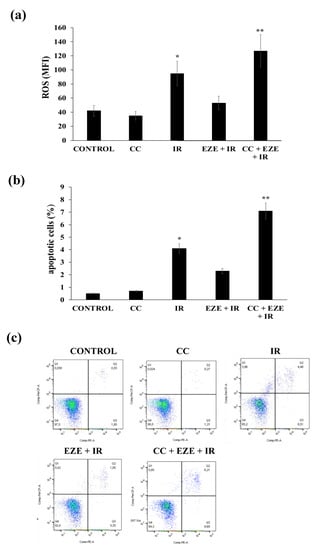 The effect of Compound C (CC) on ROS formation and apoptosis in THP-1 cells pretreated with Ezetimibe (EZE) and subjected to IR. (a) ROS formation. (b) The percentages of apoptotic cells. (c) Representative FACS analyses of the percentages of apoptotic cells. Data are represented as the mean ± SD of measurements performed in triplicate in three different experiments; * p < 0.01 vs control; ** p < 0.01 vs. IR and EZE + IR.
