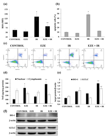 3.2. Effect of Ezetimibe on the Oxidative Stress, Apoptosis and NF-kB Activation Induced by IR